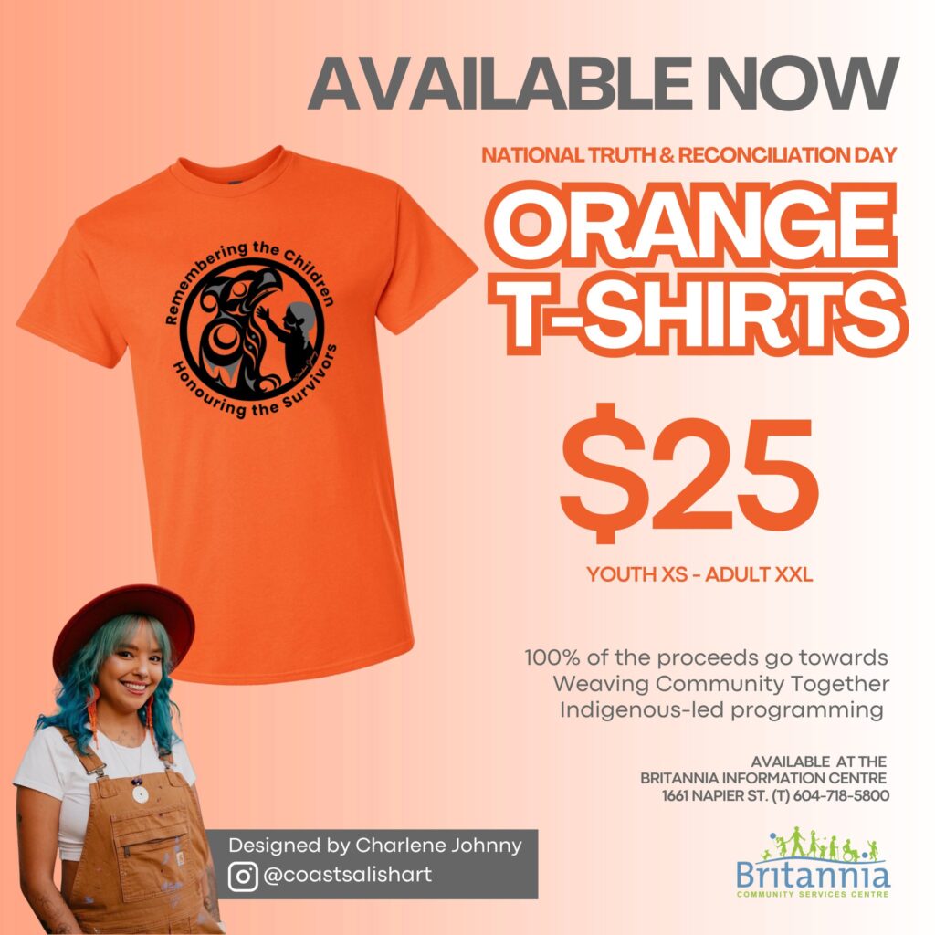 AVAILABLE NOW! Orange T-Shirts Designed by Coast Salish Artist https://charlenejohnny.com Grab yours today at the Britannia Info Centre!