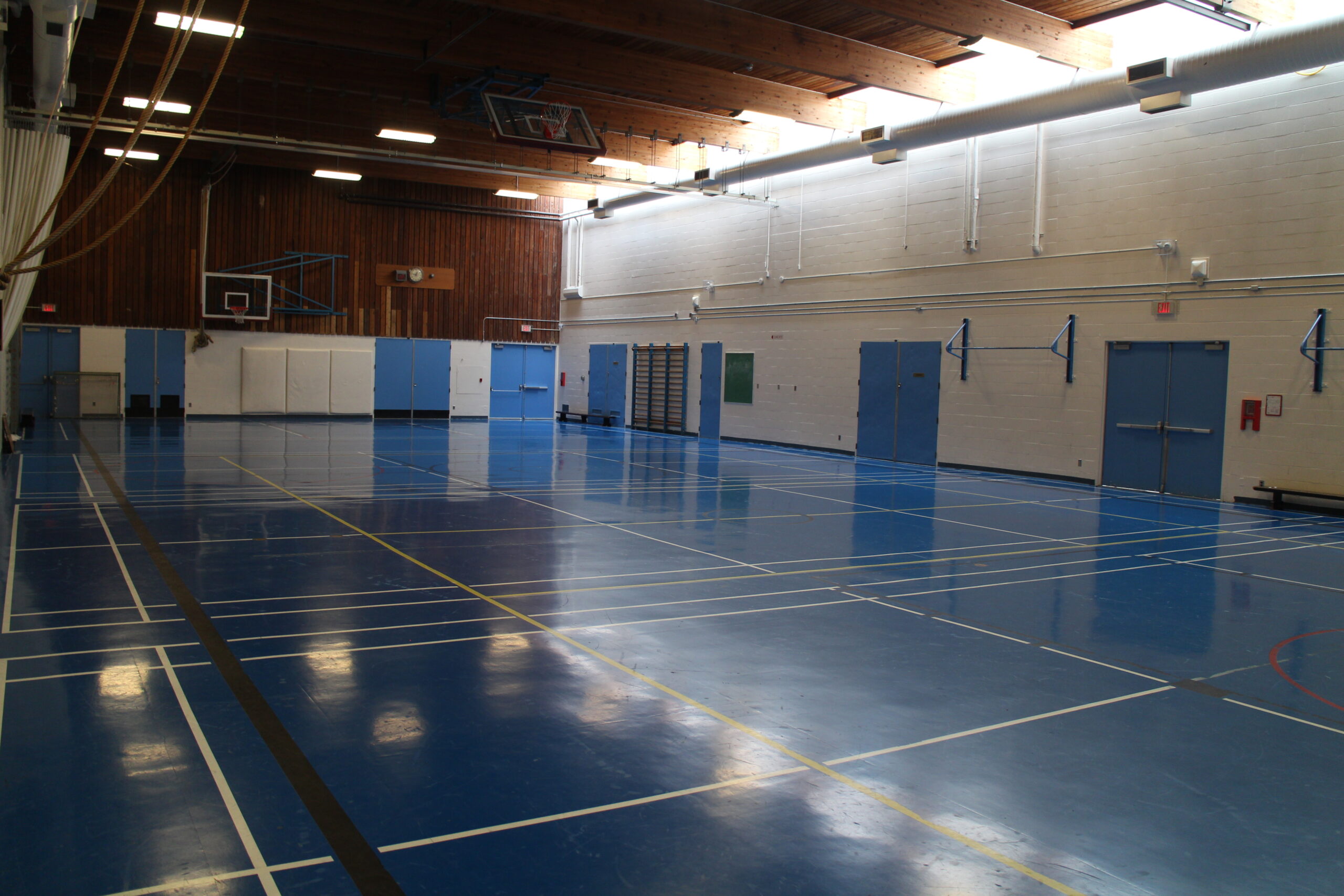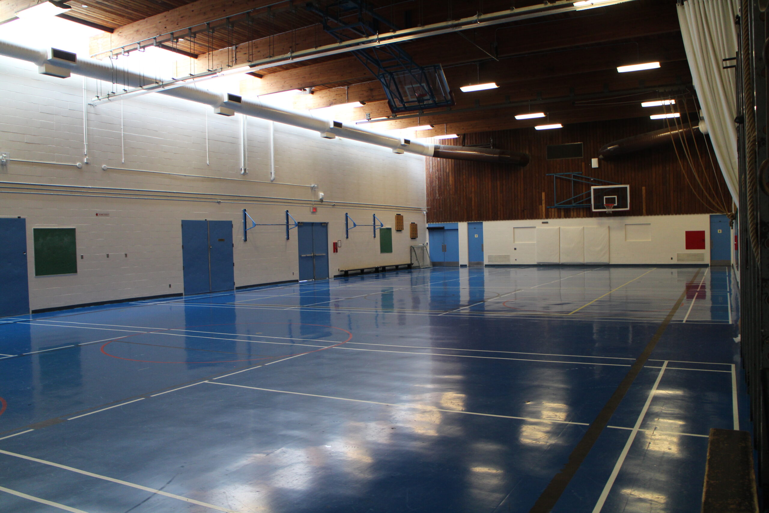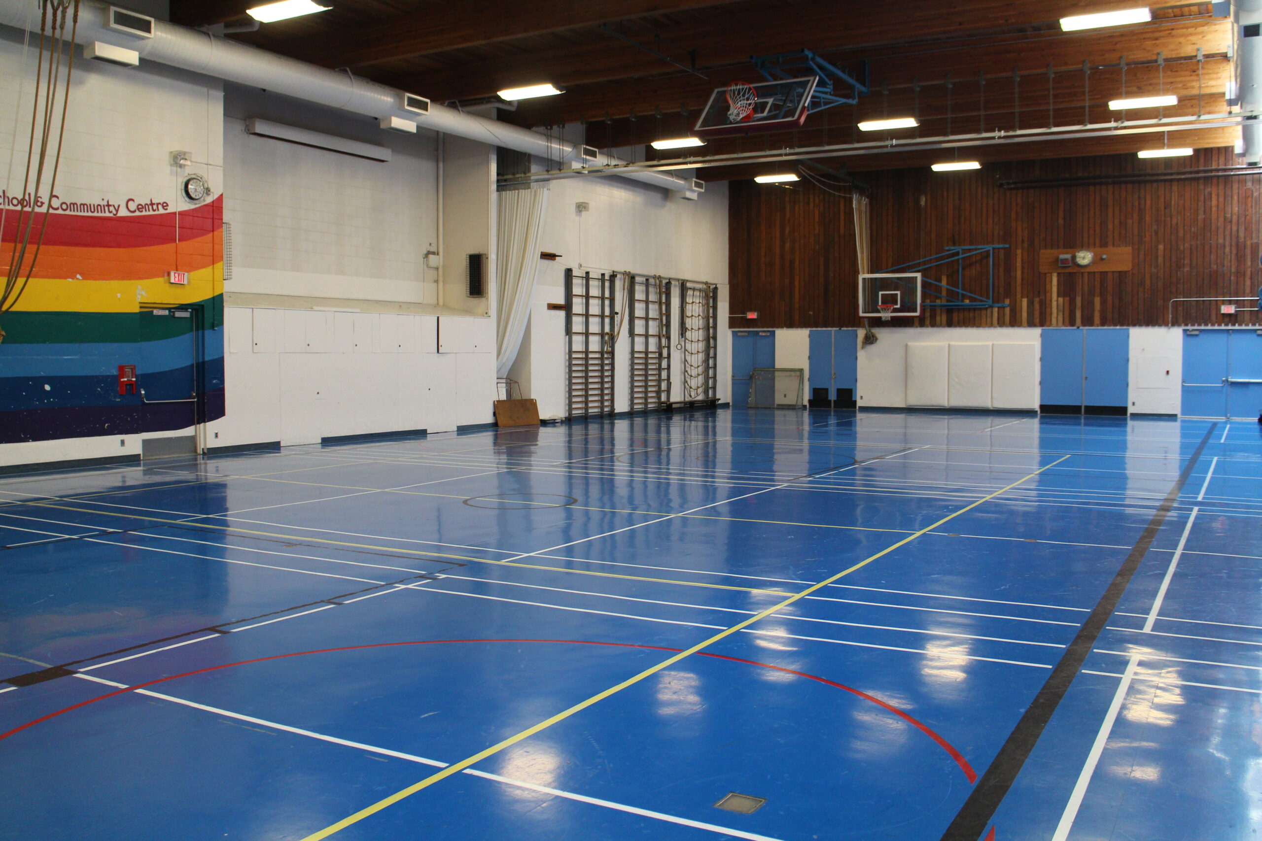 Gymnasium D is located on-site at the Britannia Community Centre, separate from the Pool and Fitness Centre Building. The gym is a multi‑purpose court used for sports like basketball, volleyball, gymnastics, community classes or school PE.